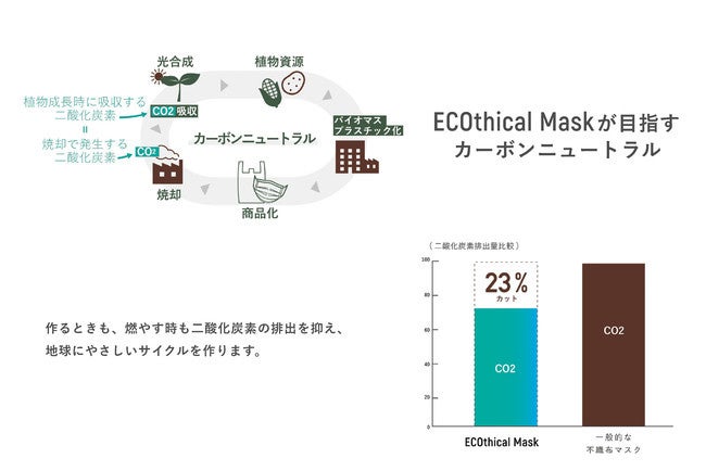 ECOthical Maskは、製造・焼却の観点で、一般的な不織布と比較し、CO2の排出を大幅にカットすることで2050年までのカーボンニュートラルの実現を目指します。