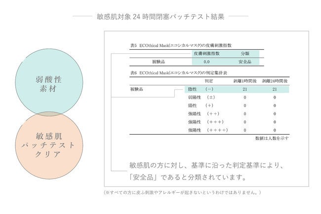植物由来の不織布を使用したECOthical Maskは、肌にやさしいマスクです。 人の素肌のpHバランスは中性より少し酸性の「弱酸性」です。 肌に近い弱酸性の素材を使用することで、肌への刺激を軽減。 敏感肌の方も安心してお使いいただけます。