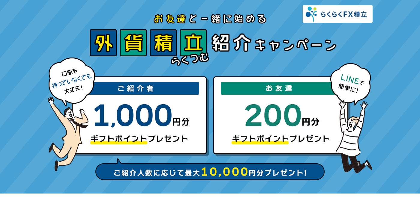 キャンペーン参加ページから参加登録をし、「giftee reward」をお友達登録している方(「ご紹介者様」)が、『らくらくFX積立』に興味をお持ちの方(「お友達」)を紹介していただき、後日その「お友達」が条件(新規口座開設)を達成された場合には、「ご紹介者様」にはもれなく1,000円分のギフトポイント、「お友達」にはもれなく200円分のギフトポイントをプレゼントいたします。