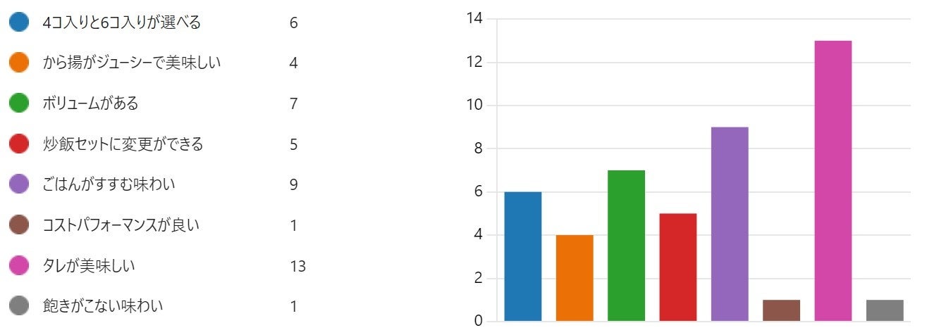「4コ入り油淋鶏弁当」で最も多くの票を集めたのは『タレが美味しい』というポイントでした。以下2位は『ごはんがすすむ味わい』、『ボリュームがある』でした。