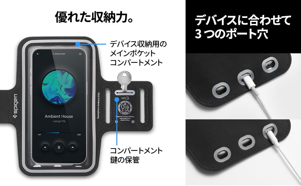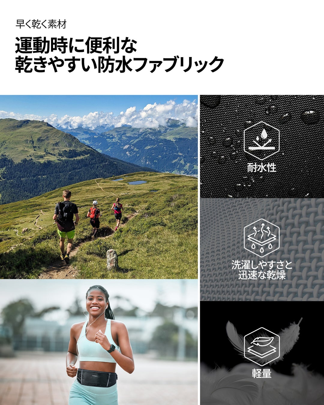 超軽量34g。ランナーのための快適フィットなアームバンド。汗に強く、快適な装着感。洗濯も簡単!スマートフォンや鍵を安全に収納しながら、動きやすさを実現します。