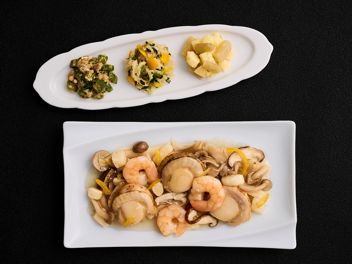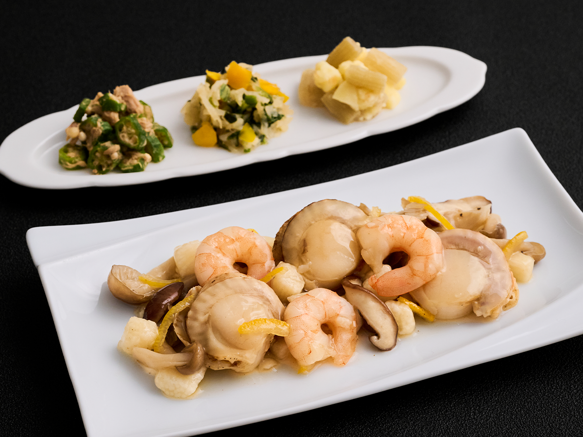 帆立は低脂肪で高タンパク、さらにビタミンB12や亜鉛などのミネラルが豊富で、疲労回復や免疫力向上にも効果があるといわれている食材です。副菜としては、生姜の香りがふんわりと漂うオクラとツナの生姜醤油、大根と野沢菜の食感が楽しいあえ物、そしてまろやかな蕗入りポテトが添えられています。