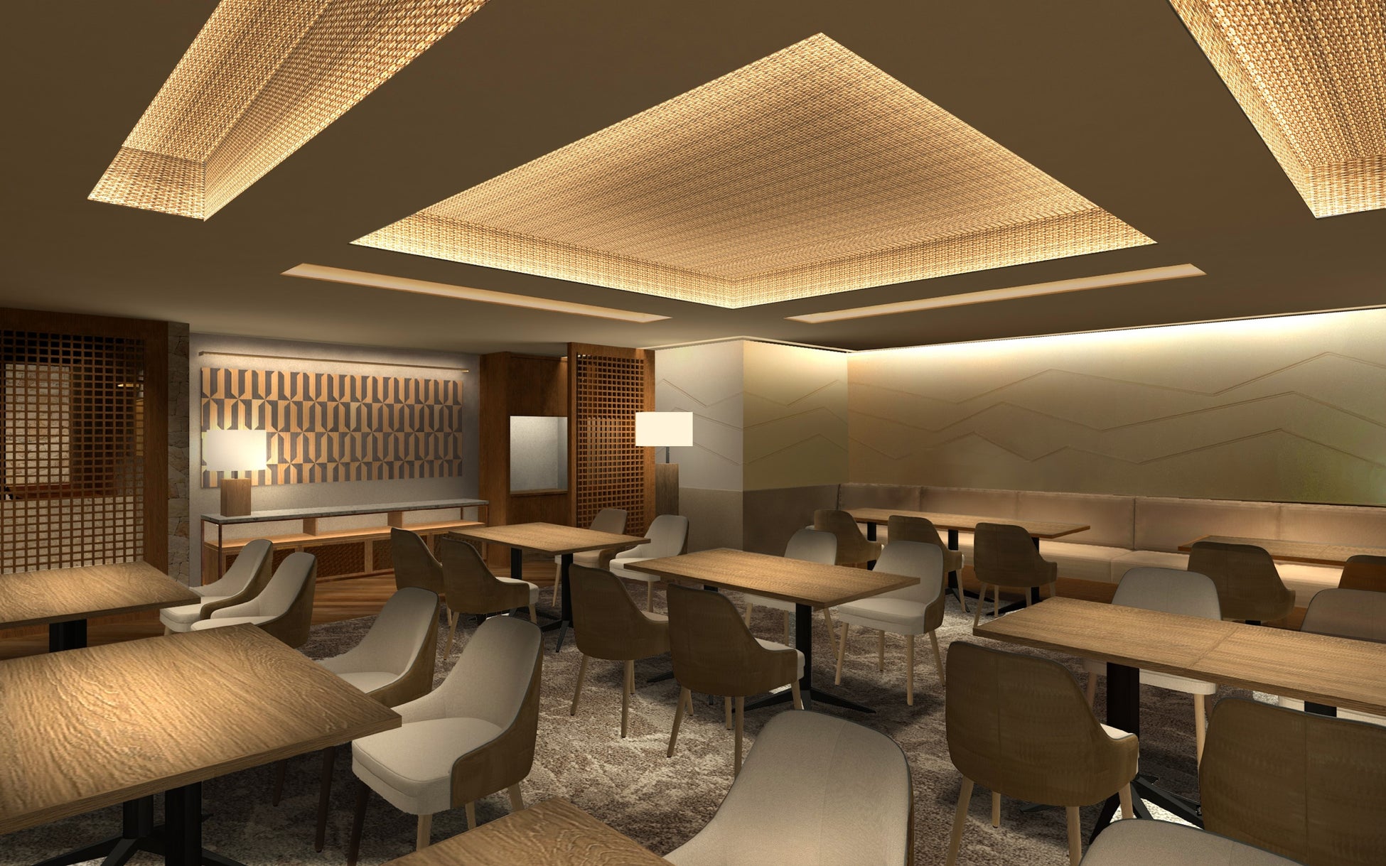 ライブキッチンを中心としたブッフェエリアは、左官や大理石を用いたカウンターとラタンを使いリゾート感を演出。天井面はヨーロッパのパーゴラを連想させる要素で構成し、床は日本の土間のような、内でありながら外のようでもある半屋外の設定としました。テラス席と室内のテーブルは、湖畔側へと続く風景の広がりをより体感してもらうために、あえて空間の境界を曖昧にしています。テーブル席、テラス席、湖畔へと繋がるランドスケープのそれぞれのゾーンを緩やかに分けながら、新しい視点で浜名湖周辺の景観の美しさと地域の魅力を伝える空間にしています。