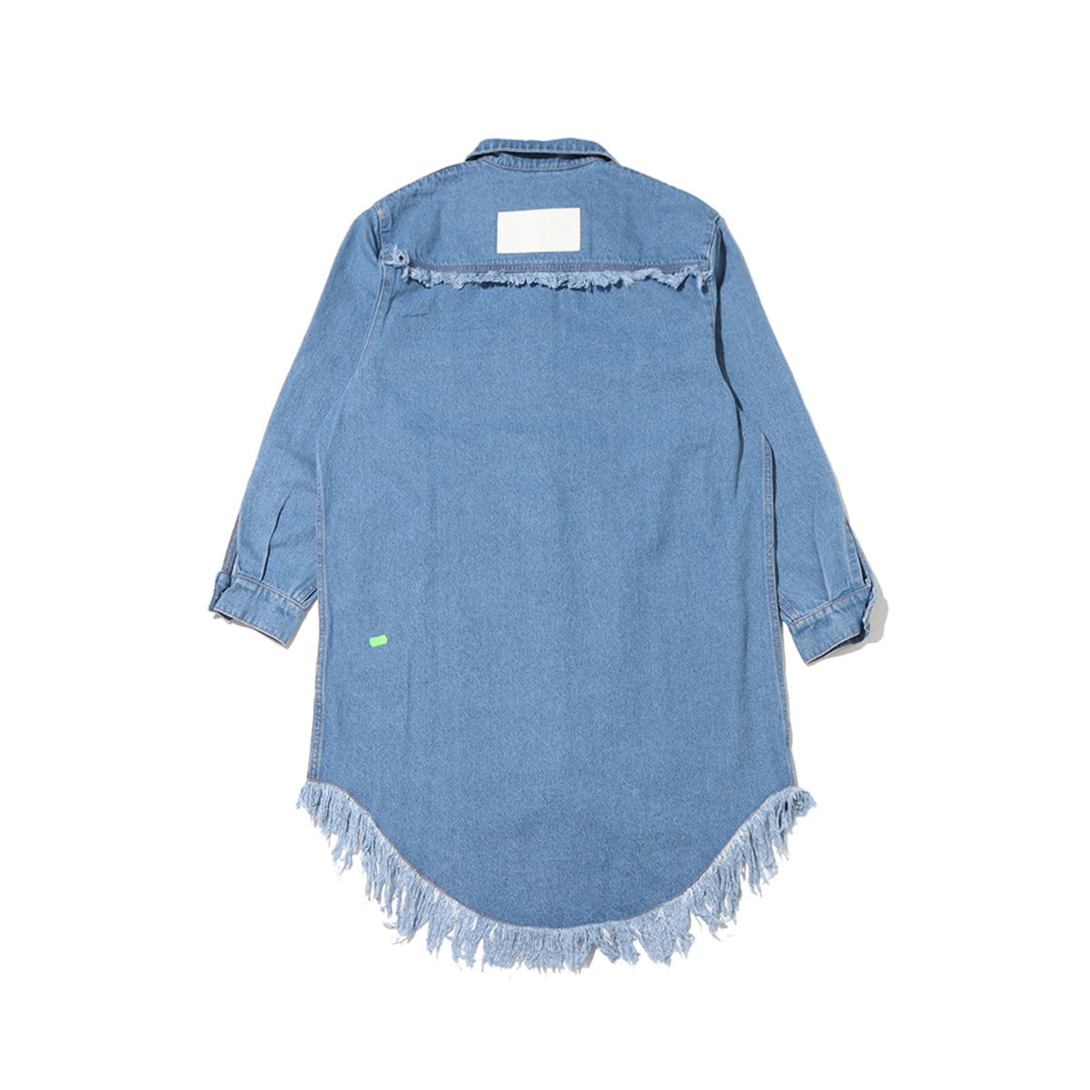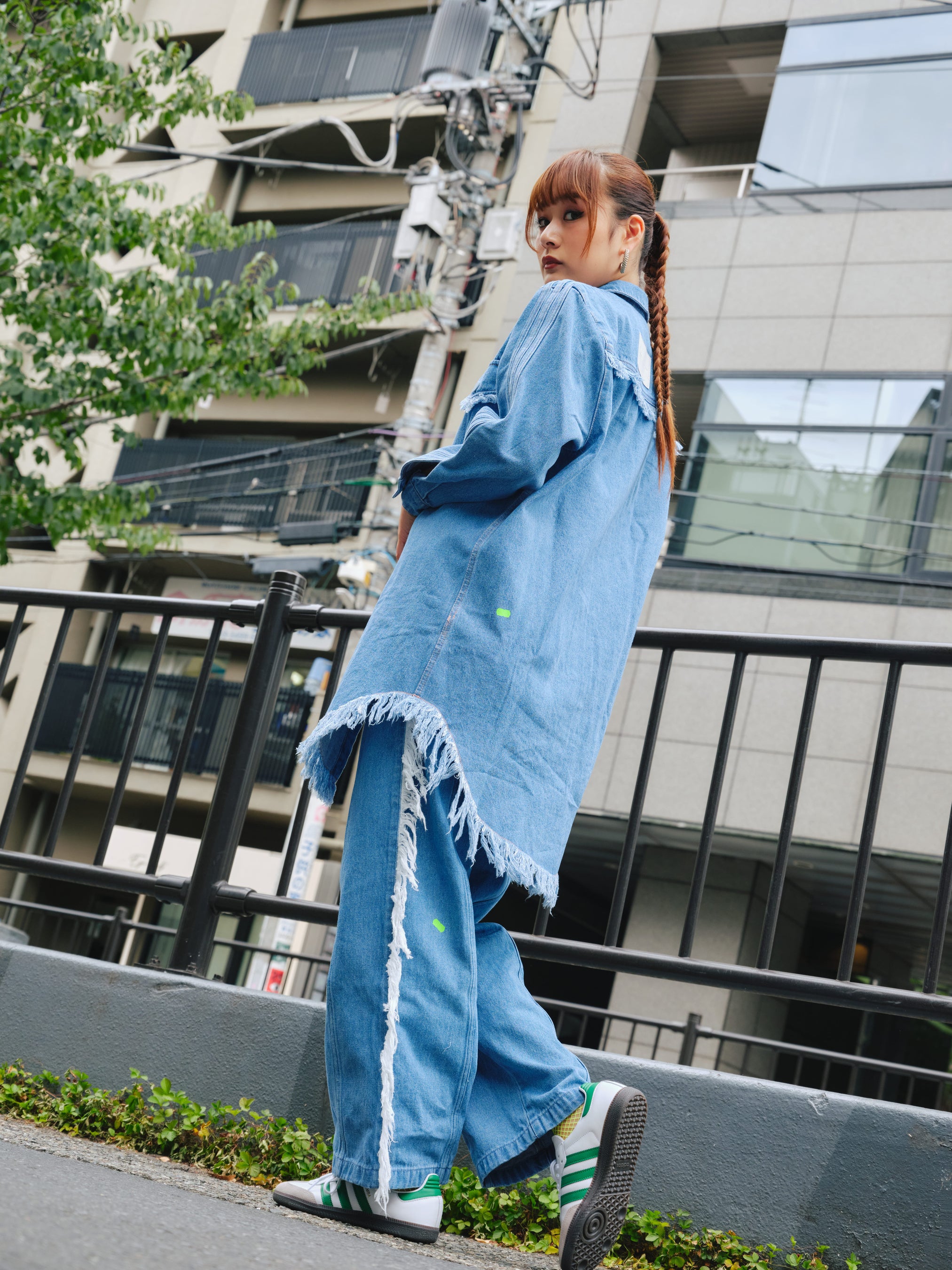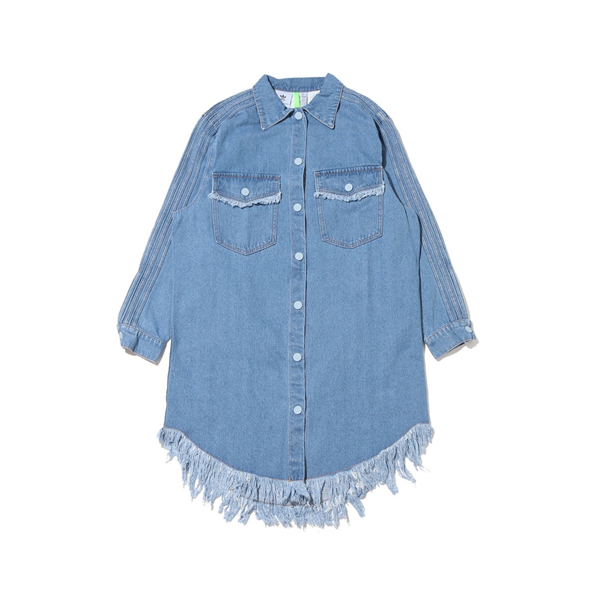 DENIM SHIRT DRESS は、1枚でワンピースとしても、フロントボタンを開けて羽織としても着用でき、幅広いスタイリングが楽しめるデザインです。袖には adidas Originals のアイコンであるスリーストライプスを同素材であしらい、フラップや裾にほどこしたフリンジでクラシックなスタイルにアクセントを加えました。