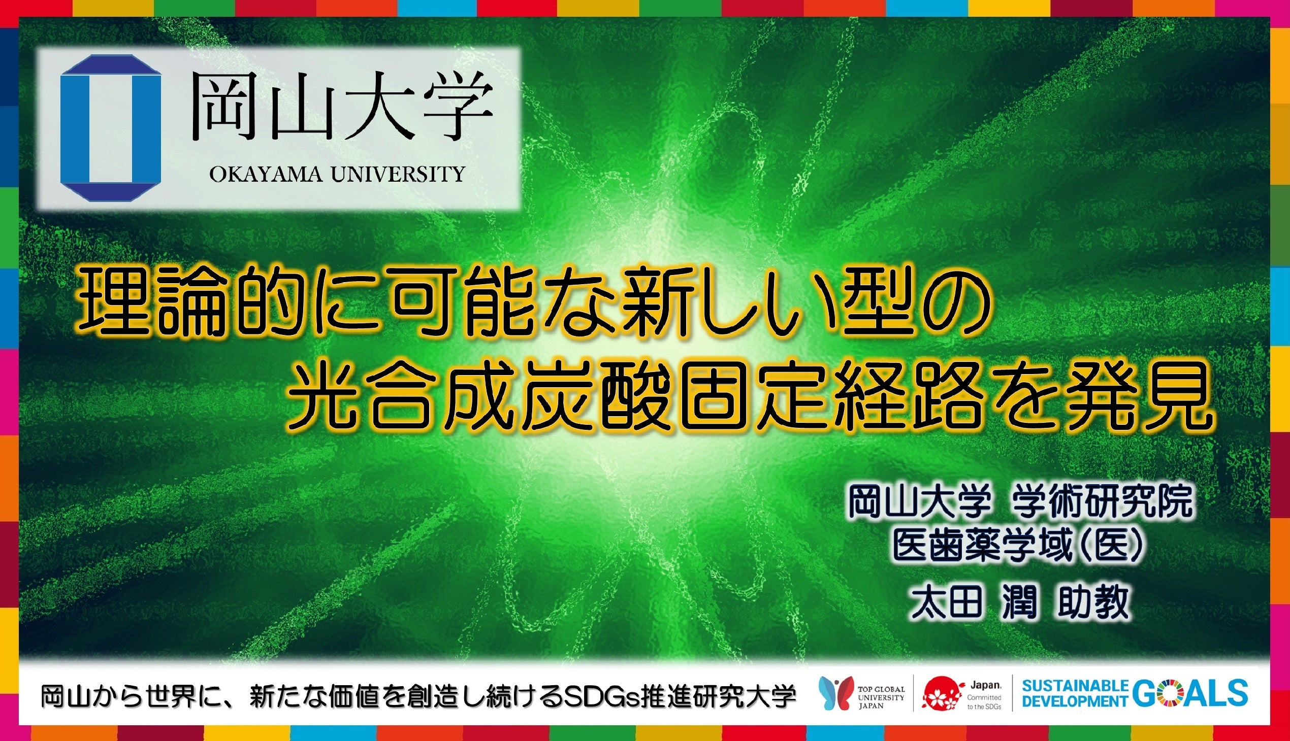 国立大学法人岡山大学(本部:岡山市北区、学長:槇野博史)学術研究院医歯薬学域(医)の太田潤助教は、理論的に可能な新しい型の光合成炭酸固定経路をコンピュータ計算により発見しました。この研究成果は2022年3月16日の日本時間19:00、英国の科学誌「Scientific Reports」のArticleとして公開されました。