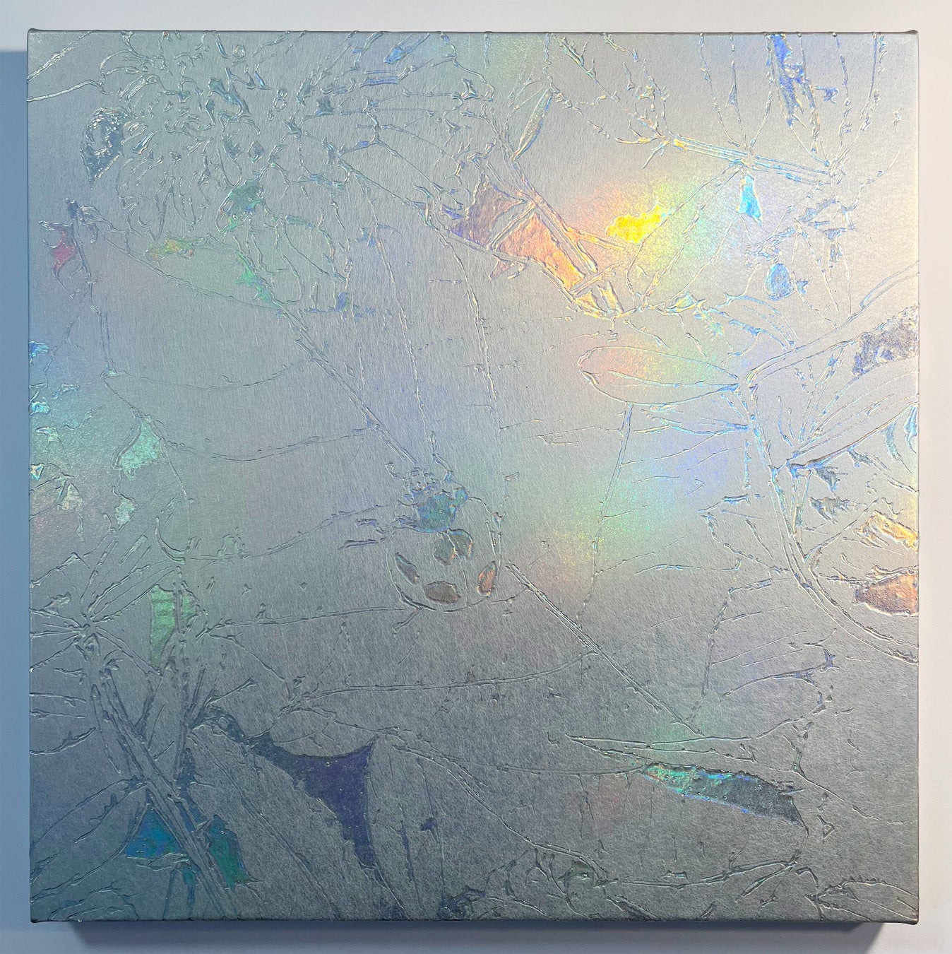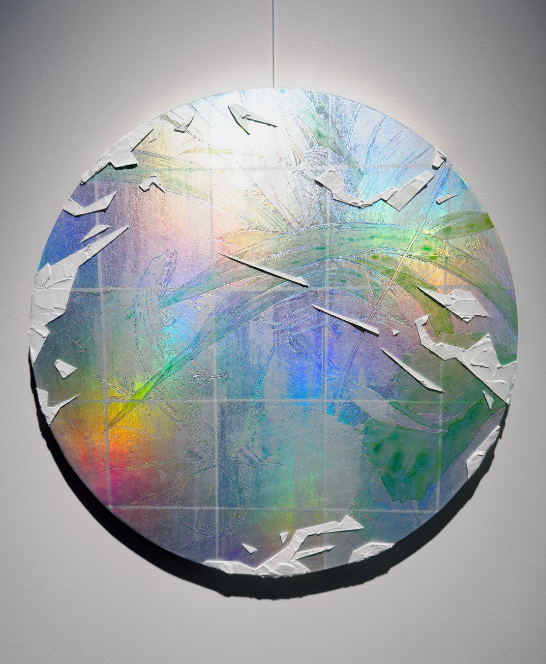 ホログラム素材に透明な絵の具を用いて“輝きを描く”独自の技法により、作品は見る角度によって表情を変え、虹色の光を浮かび上がらせます。光の屈折を利用することで、特定の色に限定されない多層的な輝きが生まれ、現実の多面性が視覚化されます。