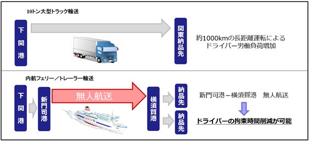 下関港から関東圏への長距離輸送において、輸送部分のほとんどを国内フェリーに切り替える輸送は、ドライバーの長時間労働の改善につながることから、物流の「2024年問題」解決策となる。