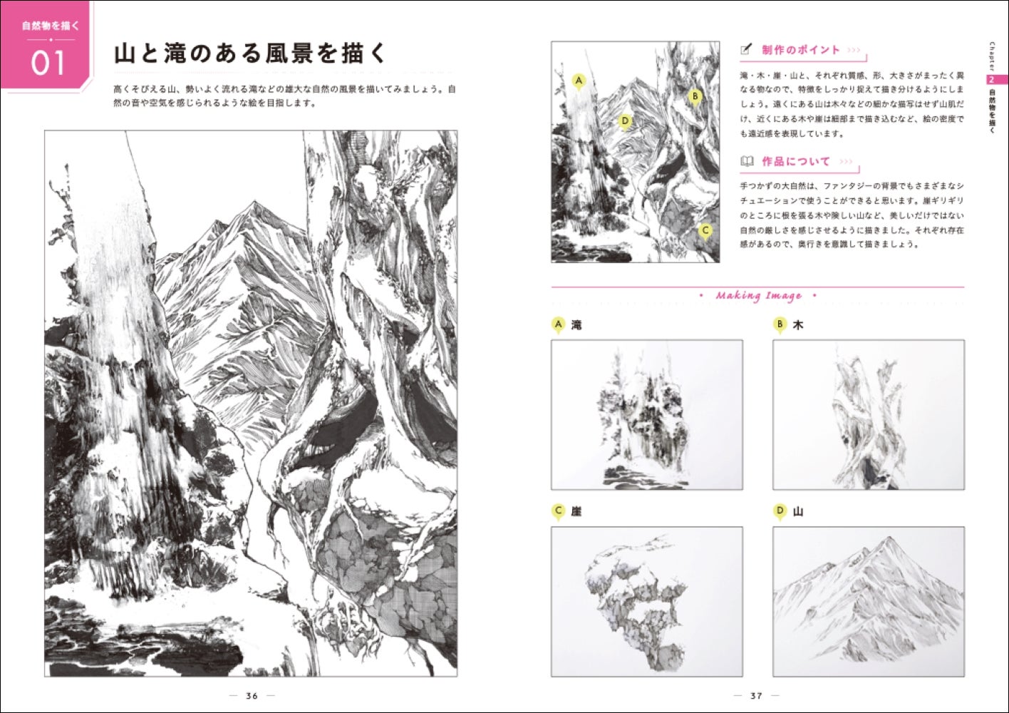 2章 自然物を描く/山と滝のある風景を描く・月夜の海を描く・深い森の風景を描く