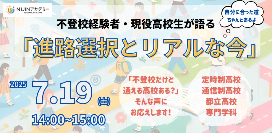 2025年7月19日(土)不登校オルタナティブスクール「NIJINアカデミー荻窪校」(東京都杉並区)にて、進路に悩む不登校の中学生と保護者を対象にした少人数の講演会「不登校経験者・現役高校生が語る『進路選択とリアルな今』」を開催いたします。