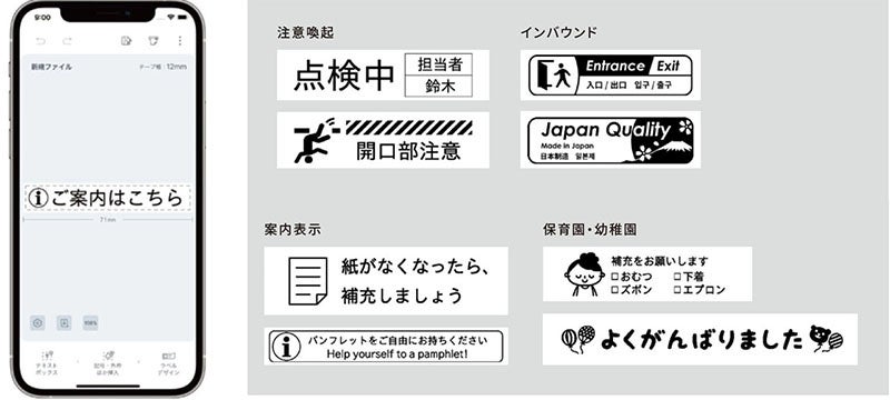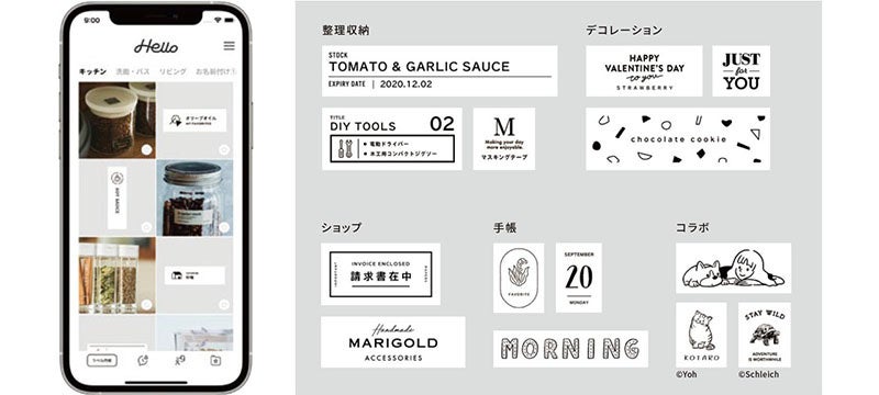 “MARK”は4mm~24mm幅のテープカートリッジが使用でき、「テプラ」最上位機種同等の高精細ヘッド(360dpi)で、繊細なデザインをきれいに印刷することができます。また、豊富なテンプレートからデザインを探し、用途に合わせてラベル作成ができる対応アプリ「Hello」内では、“MARK”の新色の発表に合わせて、イラストレーターのYoh氏がデザインしたテンプレートを約30点、絵文字は約100点を8月1日と8月24日の2回に分けて追加します。