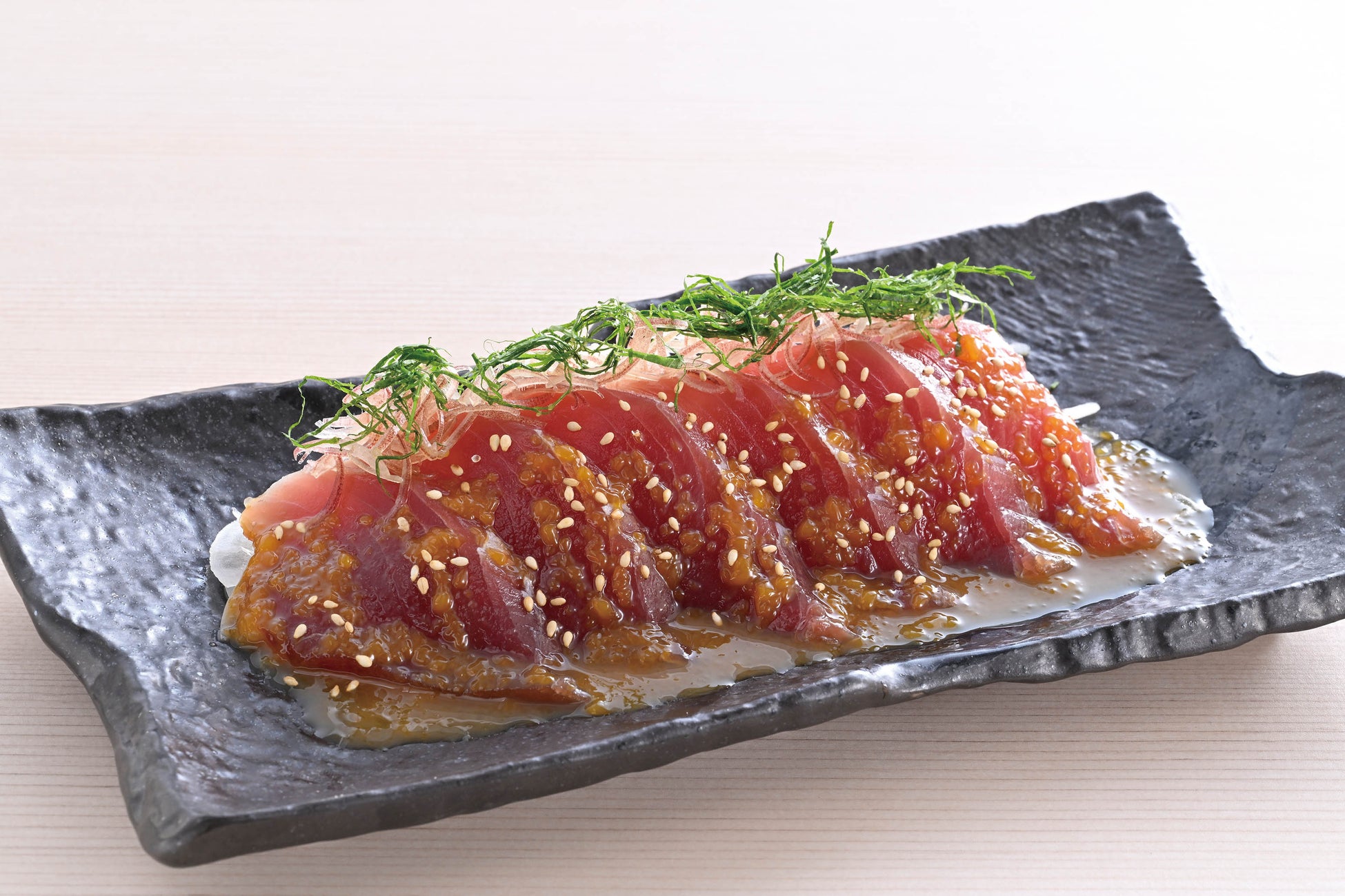 鮮度抜群のぶえん鰹の旨みと、もちもちとした食感が絶品といえる一品です。黄身ソースのコクと、醤油の塩味が、鰹の旨みをさらに引き立てます。