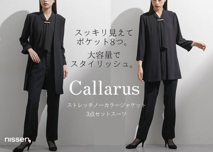 株式会社ニッセン(本社:京都市南区、代表取締役社長:羽渕淳)は、レディースフォーマルブランド「Callarus(カラルス)」の新商品として、袱紗(ふくさ)がすっぽりと入る大きなポケットが特長の多ポケットブラックフォーマル「ノーカラージャケット3点セットスーツ」を、2025年4月24日11時に、ニッセンオンラインショップ(https://www.nissen.co.jp/)で予約販売を開始しました。
