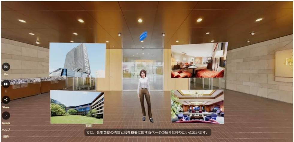 アバターの採用担当が会社概要や事業内容などを説明します。また、メタバース上に再現された「ホテルグレイスリー新宿」「ホテル椿山荘東京」「箱根ホテル小涌園」を見て回ることができます。