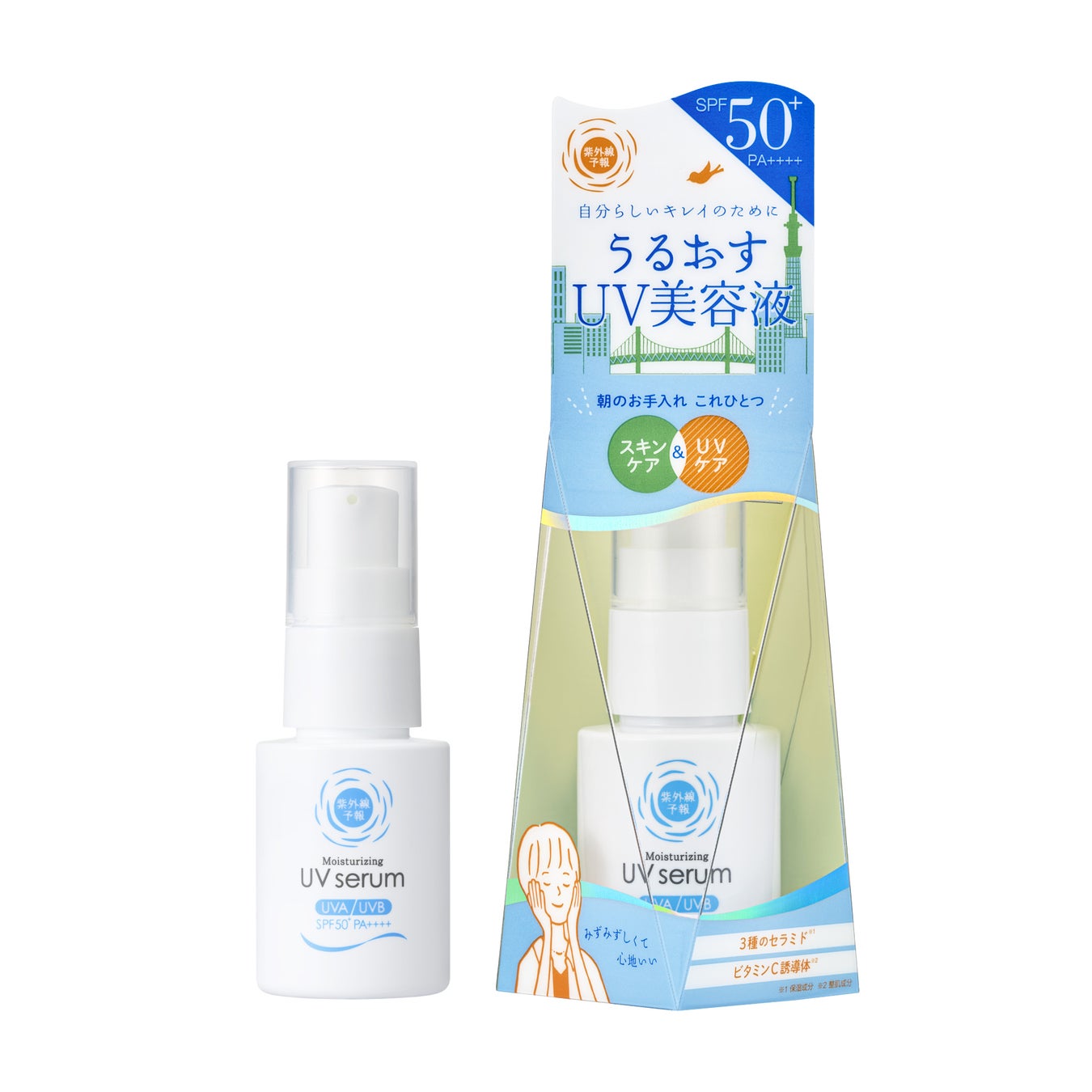 朝のスキンケア~UVケアまでがこれひとつでOK!うるおいkeepする3種のセラミドと、透明感UPするビタミンC誘導体(整肌成分)を配合。忙しい朝にうれしいUV美容液です。