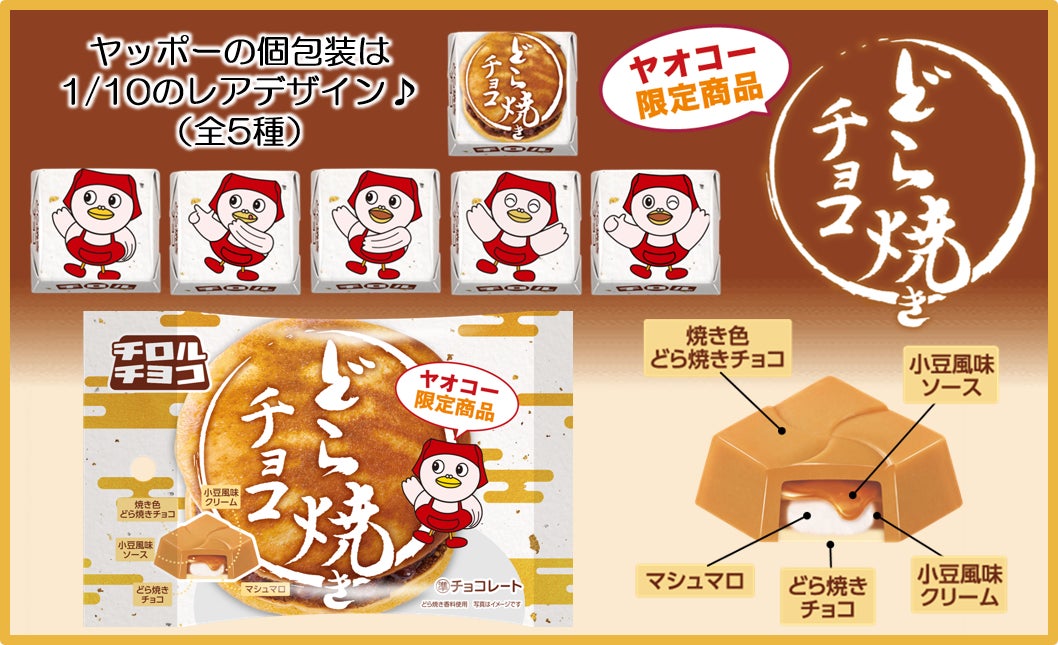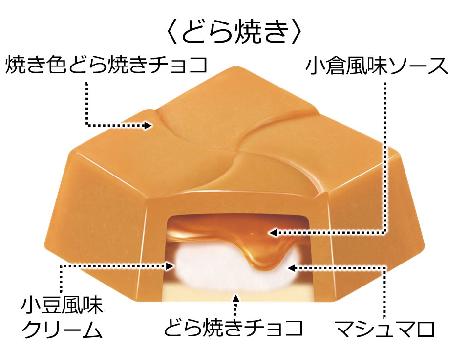 黒糖の風味を感じるどら焼きチョコで、小倉風味のソースとクリーム、ふわふわ食感のマシュマロを包みました。