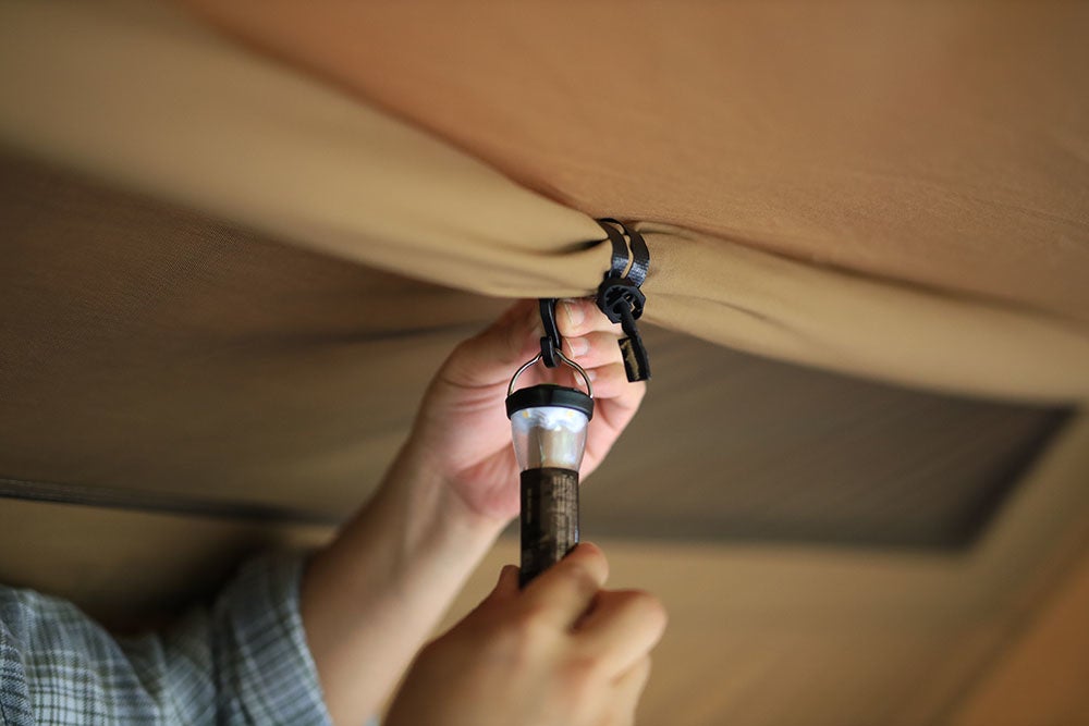 前面はフルメッシュにもなるので、インナーテントを設営する手間もなく、居住空間を広くキープすることができ通気性も抜群。また、スカートを束ねることで、より通気性を上げることも可能。テント内の空気がしっかりと循環するよう、後方上部には大きな開閉式ベンチレーションを採用しており、夏場でも涼しくお過ごしいただけます。