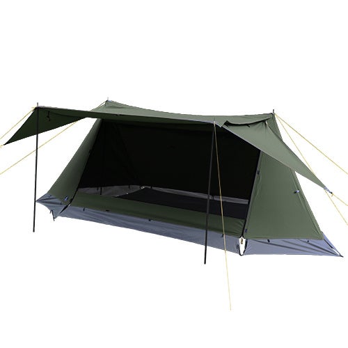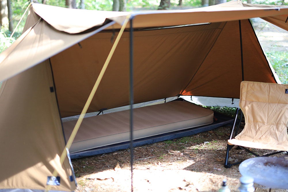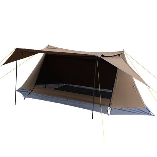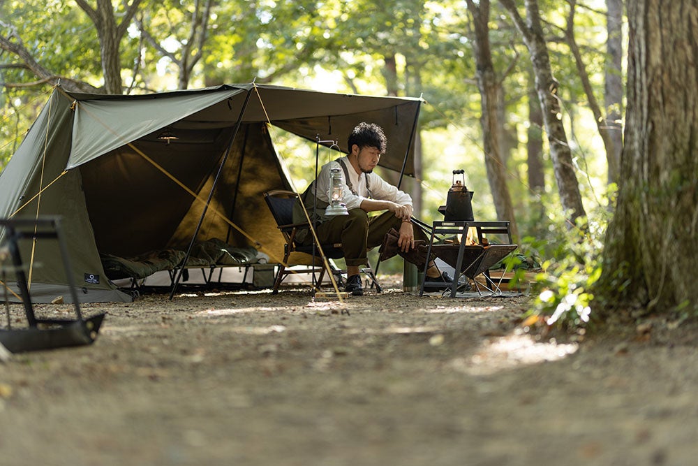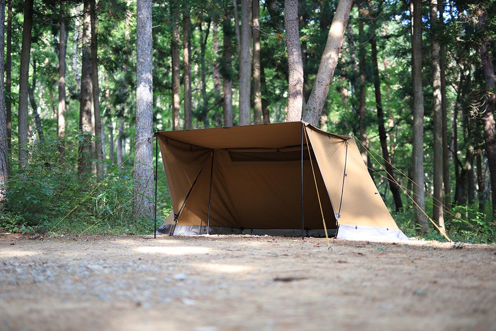 撥水性や軽量性を兼ね備えた、火に強いポリコットン素材(綿とポリエステルの混紡生地)を採用しており、火の粉などで穴が開きにくくなっておりますので、テント近くで焚き火を楽しむことが可能。また、素材感を活かしつつ、ヴィンテージ感のある洗練された雰囲気に設計。ソロキャンプにかっこよさをプラスできるメインテントとしておすすめです。