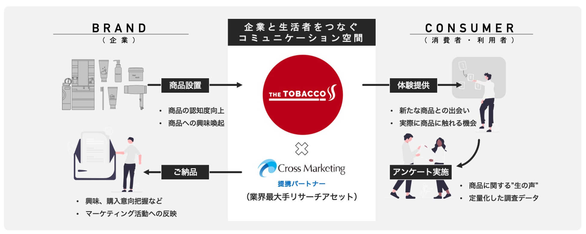 株式会社クロス・マーケティング(本社:東京都新宿区、代表取締役社長兼CEO:五十嵐 幹、以下「当社」)は、よりマナー良く・心地よい分煙の実現を目指す喫煙所ブランド「THE TOBACCO(ザ・タバコ)」を運営する株式会社コソド(本社:東京都千代田区、代表取締役CEO:山下 悟郎)と共同で、体験型の調査サービス『THE TOBACCO UX Research』の提供を開始しました。