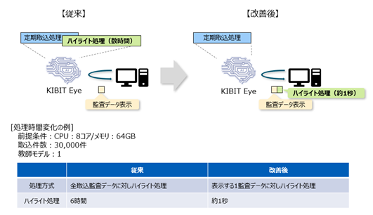KIBITハイライトは、その有用性をユーザーから高く評価される半面、データ量が特に多い大規模ユーザーにおいては、データの取り込み処理からハイライト処理の完了までに時間を要することが課題でした。そこで本機能改善では、従来の集約処理方式から、クライアント端末で選択・表示された監査データごとの個別処理方式にプロセスを変更しました。これにより、ハイライト処理にかかる時間を大幅に短縮し、サーバー負荷の低減とユーザビリティの向上を実現しました(図)。