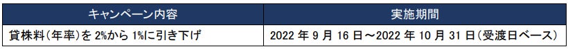 また、当社では売建サービスリリースを記念し、期間限定で貸株料を通常時の2%から1%に引き下げるキャンペーンを実施します。