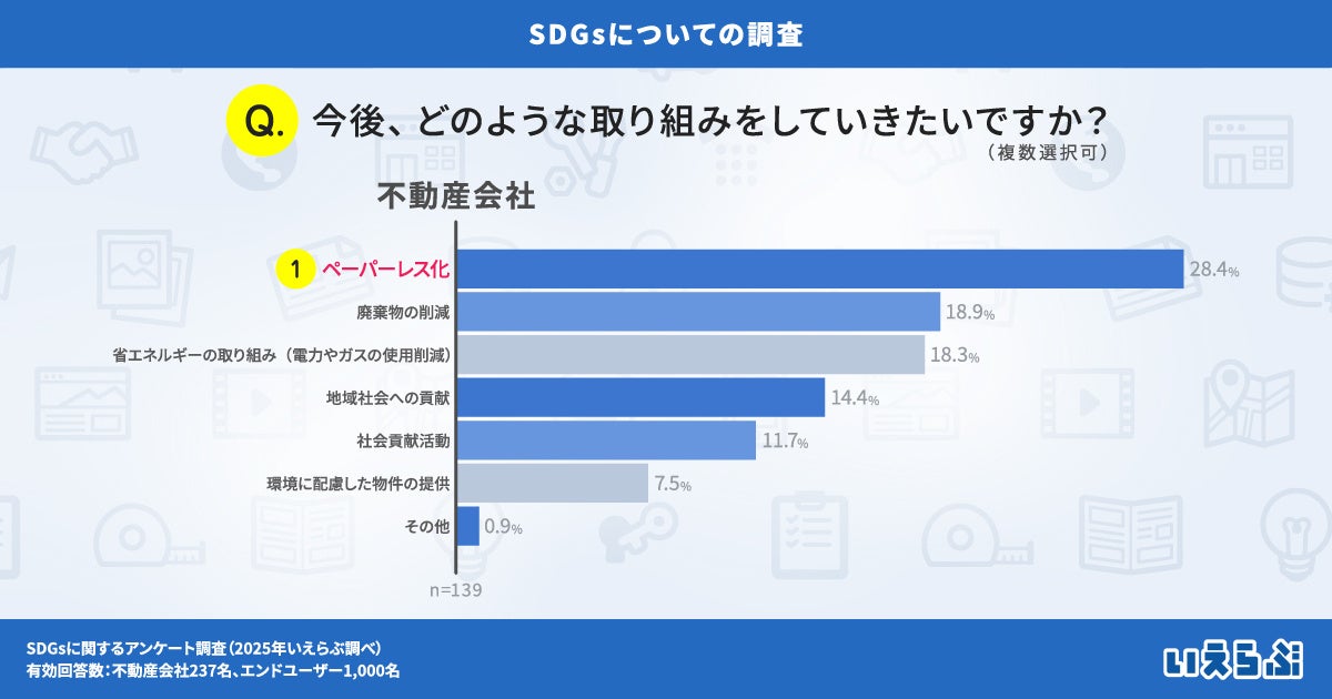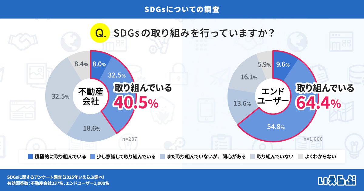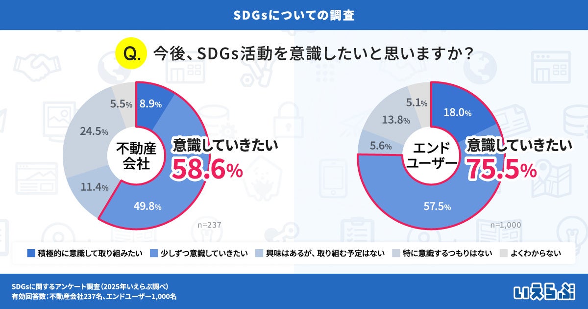 不動産業界特化のDX支援サービスを展開する、株式会社いえらぶGROUP(本社:東京都新宿区、代表取締役:岩名泰介、以下「いえらぶGROUP」)は、不動産会社・エンドユーザーに対して「SDGsに関するアンケート調査」を実施しました。有効回答1,237件(不動産会社237名、エンドユーザー1,000名)の調査結果を発表します。