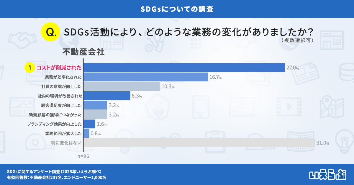 一方で、「特に変化はない」という回答も31.0%と多く、SDGs活動の効果を実感できていない不動産会社が多いことが課題として浮き彫りになりました。