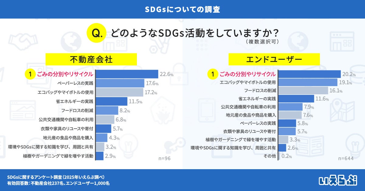 これらの結果から、不動産会社とエンドユーザーの双方が、比較的取り組みやすい活動や、日常生活で実践できる活動が多い傾向にあることが分かります。