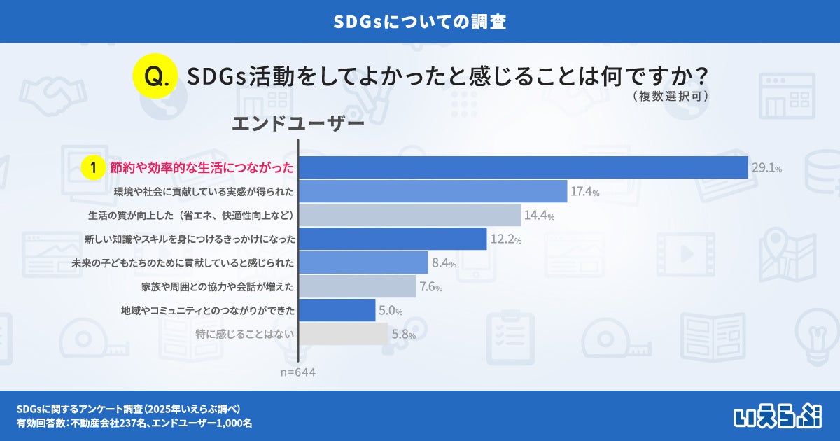 一方、エンドユーザーに「SDGs活動をしてよかったと感じることは何ですか?」と質問をしたところ、「節約や効率的な生活につながった」(29.1%)や「環境や社会に貢献している実感が得られた」(17.7%)など、SDGs活動によるメリットを感じている人が多いことが分かりました。