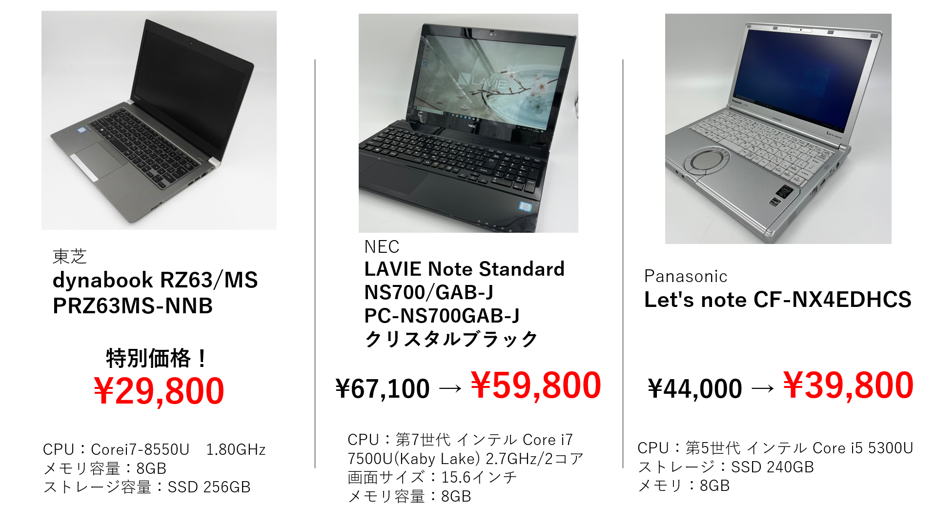 10年以上パソコン修理店を全国展開する当社ならではの技術により、中古でも長くお使いいただける機種をそろえています。「修理費用が思いのほか高く買い替えを検討している」、「リモートワークで急遽パソコンが必要になった」、「半導体不足だがすぐに安価なパソコンがほしい」など、様々な事情でお困りの方にぜひご利用いただきたいキャンペーンです。