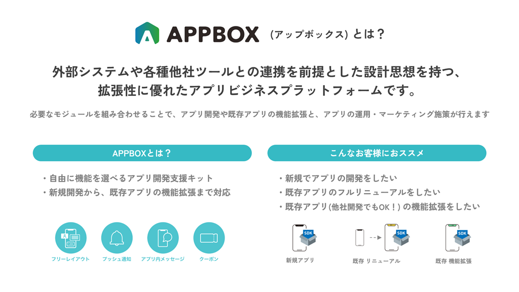 「APPBOX」は、アプリで使う各種機能群を組み合わせることで、ゼロからのアプリ開発や既存アプリの機能拡張、マーケティング施策まで、アプリビジネスに必要なすべてを支援するプラットフォームです。他社で開発したアプリの機能拡張にも活用でき、また、各種他社ツールとの連携も柔軟に行えるのが特長です。小売企業などの会員システムを導入している企業や、基幹システムとの連携が必要な企業にも対応可能です。