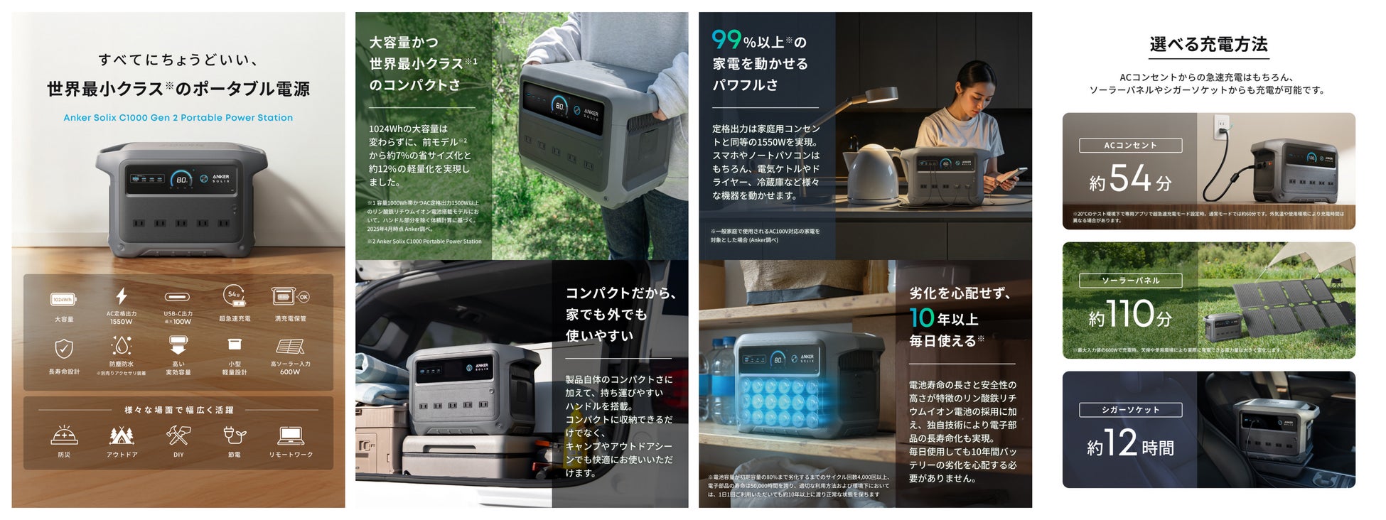 - ベストセラーの次世代モデル:Anker Solixのベストセラー「Anker Solix C1000 Portable Power Station」が、小型・軽量、本体充電時間、AC出力、製品寿命の全方位で進化した次世代モデルです。