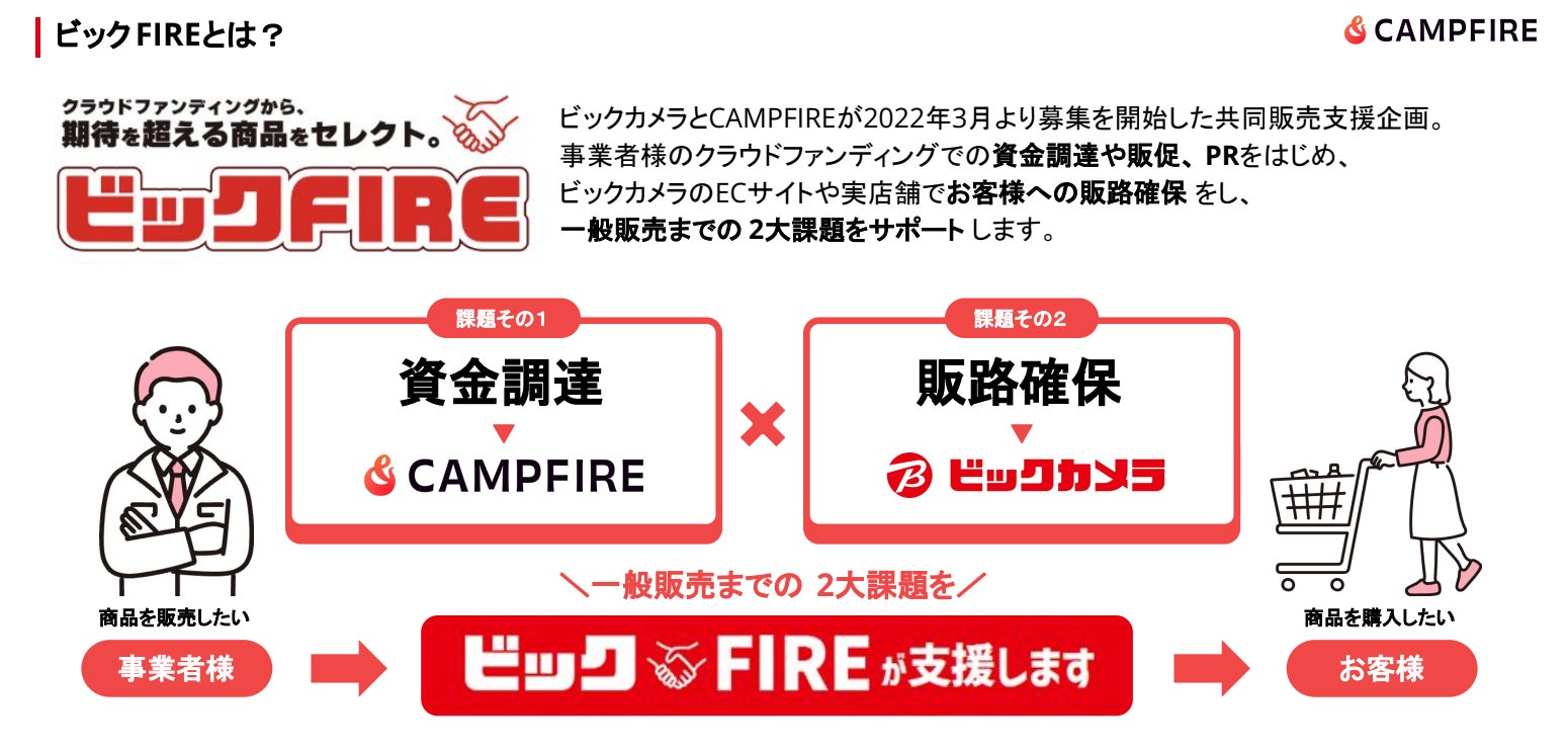 2022年より実施している「ビックFIRE」では、採択プロジェクトに対して、CAMPFIREとビックカメラがクラウドファンディングから販路提供まで、一気通貫でサポートしています。クラウドファンディングを通じて商品のPRを行うとともに、ビックカメラの一部店舗やECサイトでの販売機会も提供しています。