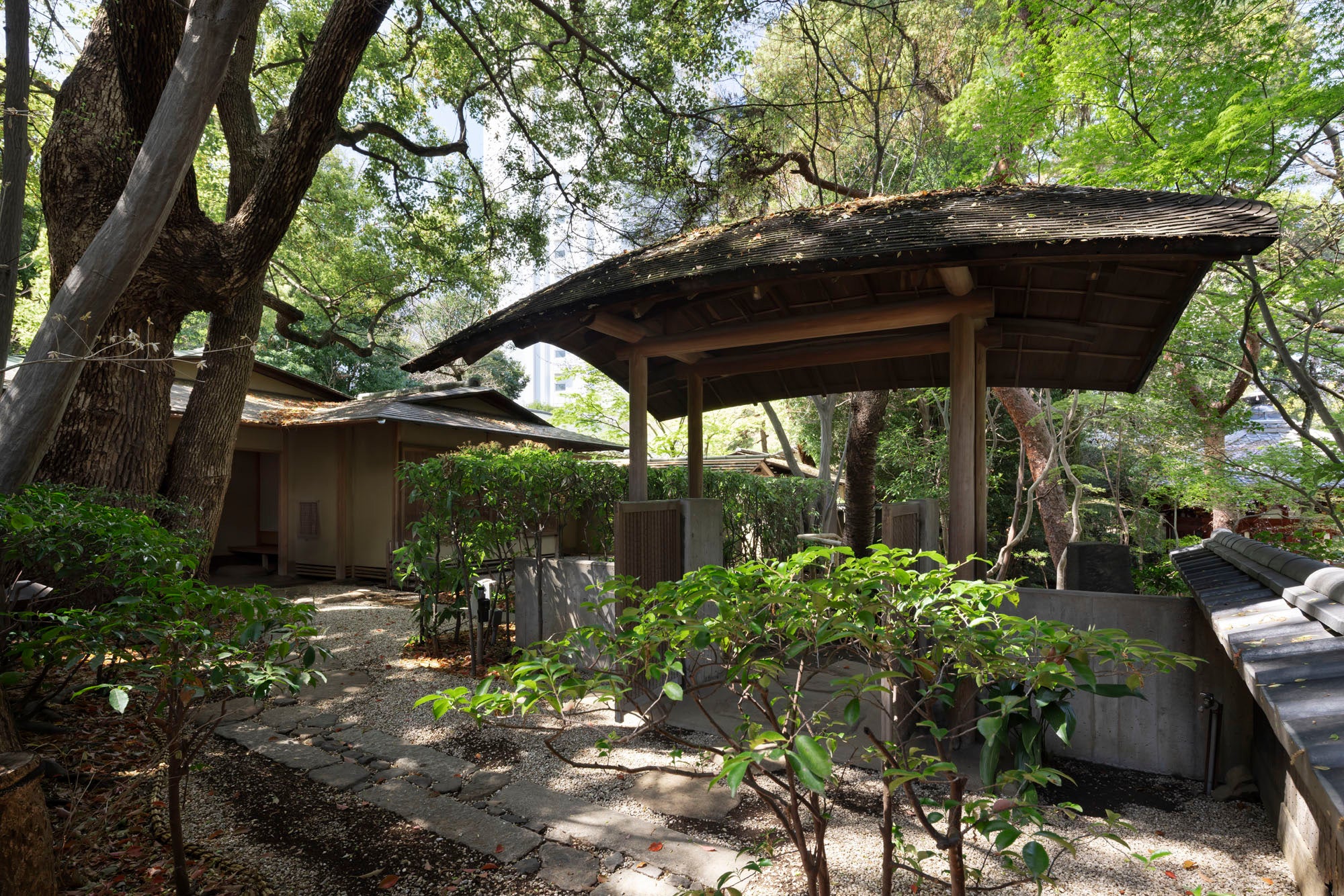 開業昭和六十年、大都会に凛と佇む隠れ家として、残月床や如庵風の趣を取り入れた複数の茶室と個室を備え、予約制で会食やお茶会の場として営業しています。庭園内の石段を登り、編笠門を抜けた先に広がる、日本の伝統美を極めた和空間です。