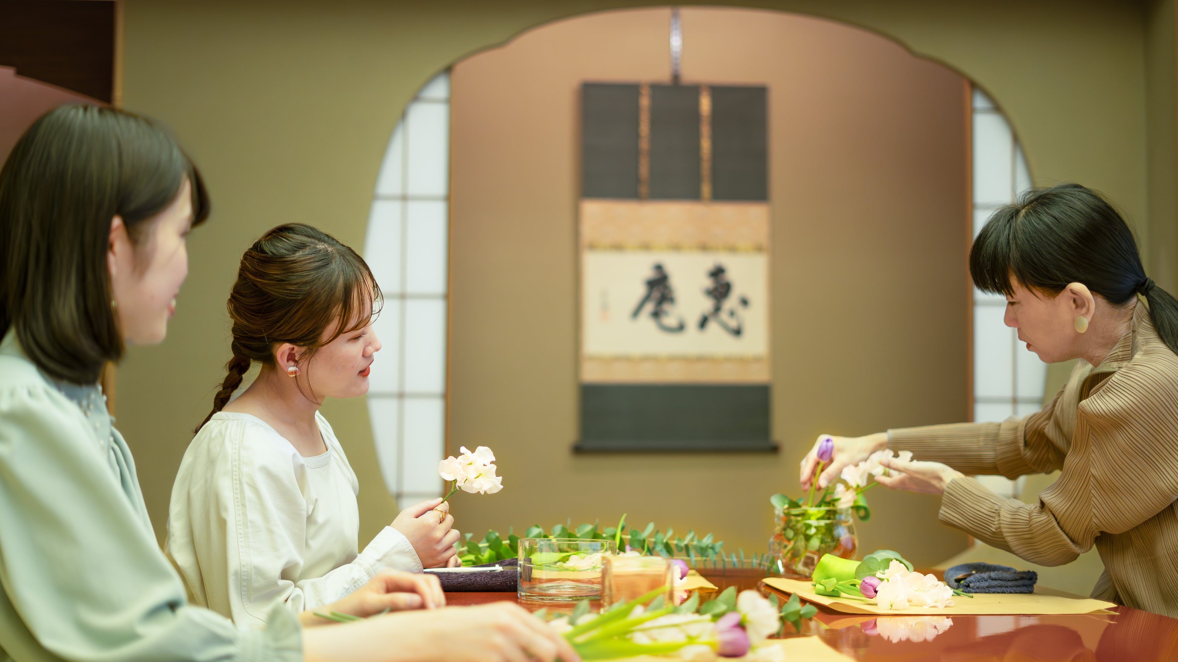 和室で春の花々に包まれながら、日本文化“いけばな”に触れる風雅なひとときをお過ごしいただけます。