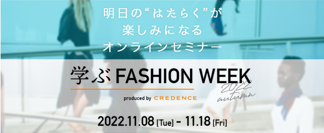 今回は、ここ数年で大きな変革を遂げたアパレル・ファッション業界ではたらく人たちを対象に、自分らしい新たな“はたらく”を見つけるきっかけをつくるため「明日の”はたらく”が楽しみになるオンラインセミナー~学ぶFASHION WEEK 2022秋 produced by CREDENCE」を2022年11月8日(火)~18日(金)に開催します。