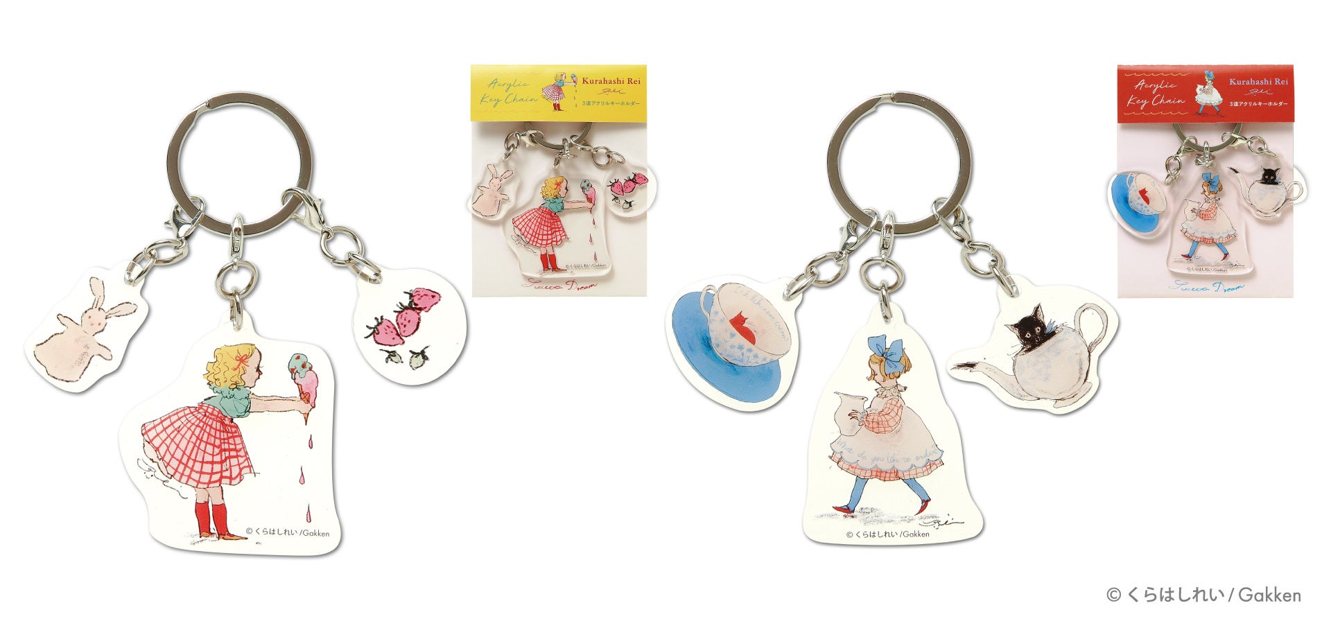女の子とねこやうさぎ、食べ物のアートの組み合わせがかわいい、3連アクリルキーホルダー。1つ1つばらばらに付けることもできるので、チャームとしてもお使いいただけます。
