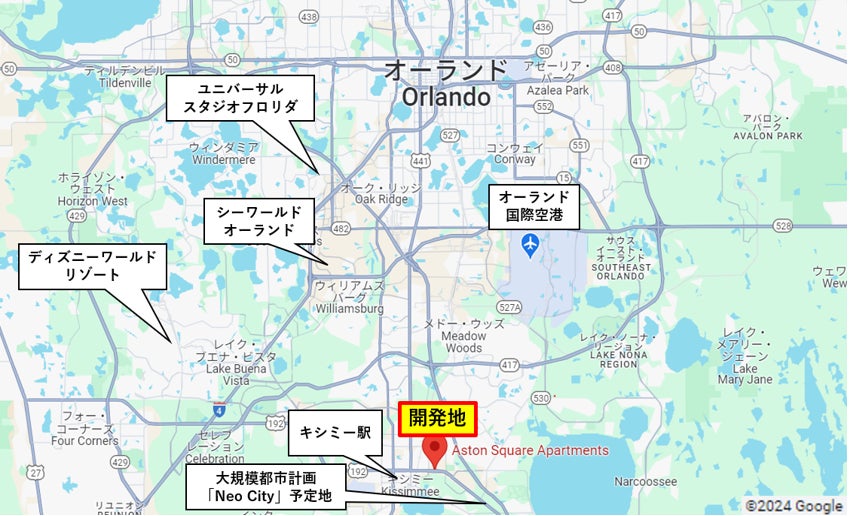 開発地はフロリダ州オーランド近郊のキシミー市に所在し、オーランド市街地まで車で約30分、オーランド国際空港まで約25分、また30分圏内にはディズニーワールドリゾートやユニバーサルスタジオフロリダ、シーワールドオーランドほか複数のテーマパークが所在し、地理的な利便性も兼ね備えた魅力的なエリアとなっております。
