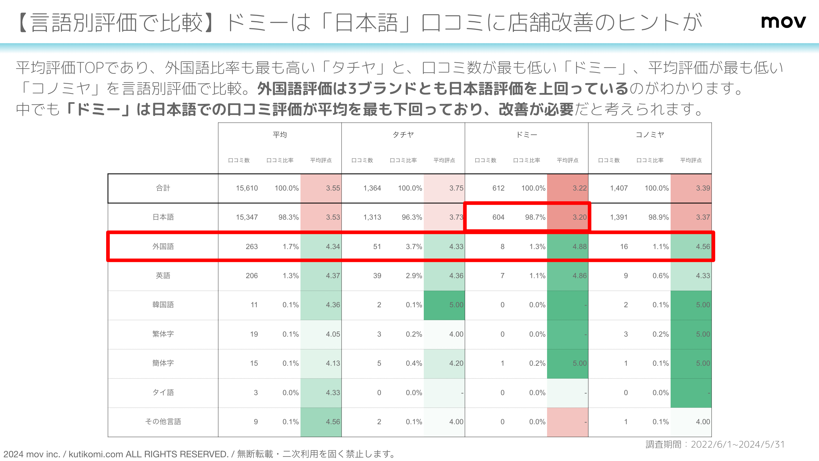 中でも「ドミー」は日本語での口コミ評価が平均を最も下回っており、改善が必要だと考えられます。