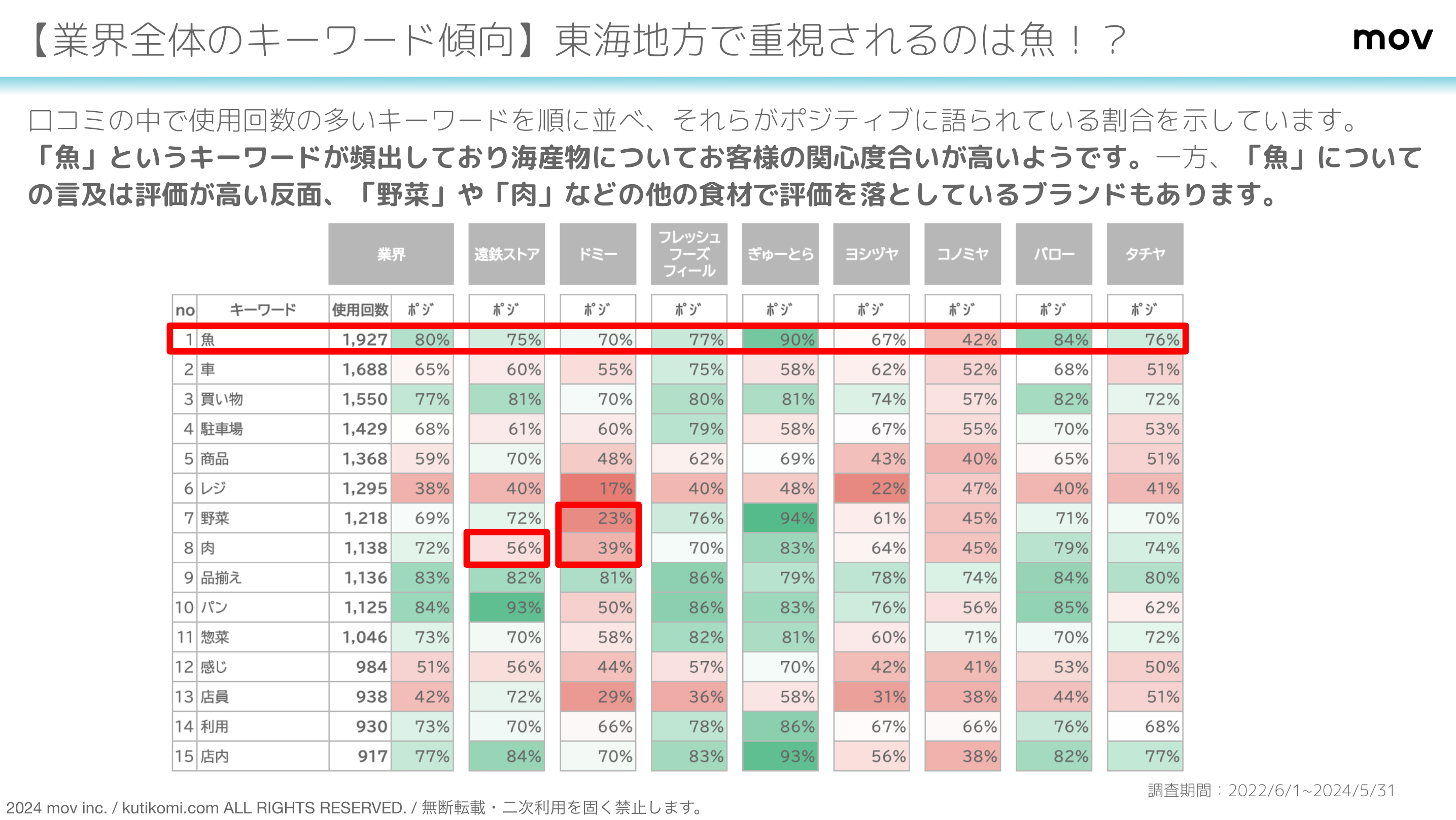 一方、「魚」についての言及は評価が高い反面、「野菜」や「肉」などの他の食材で評価を落としているブランドもあります。