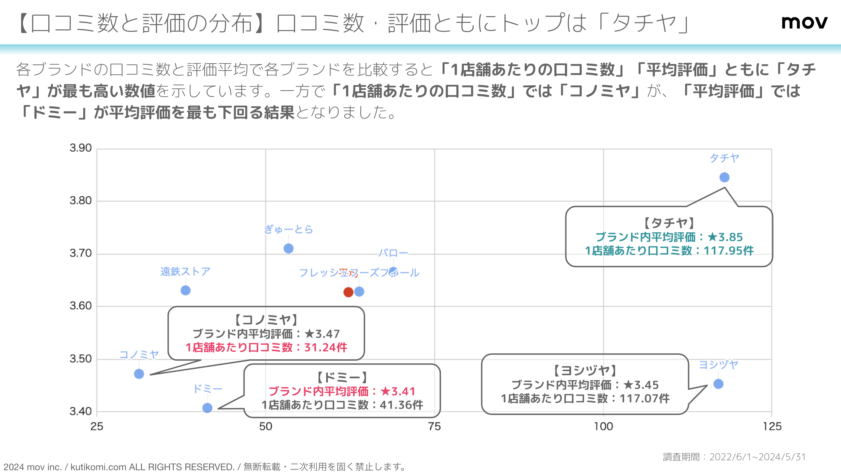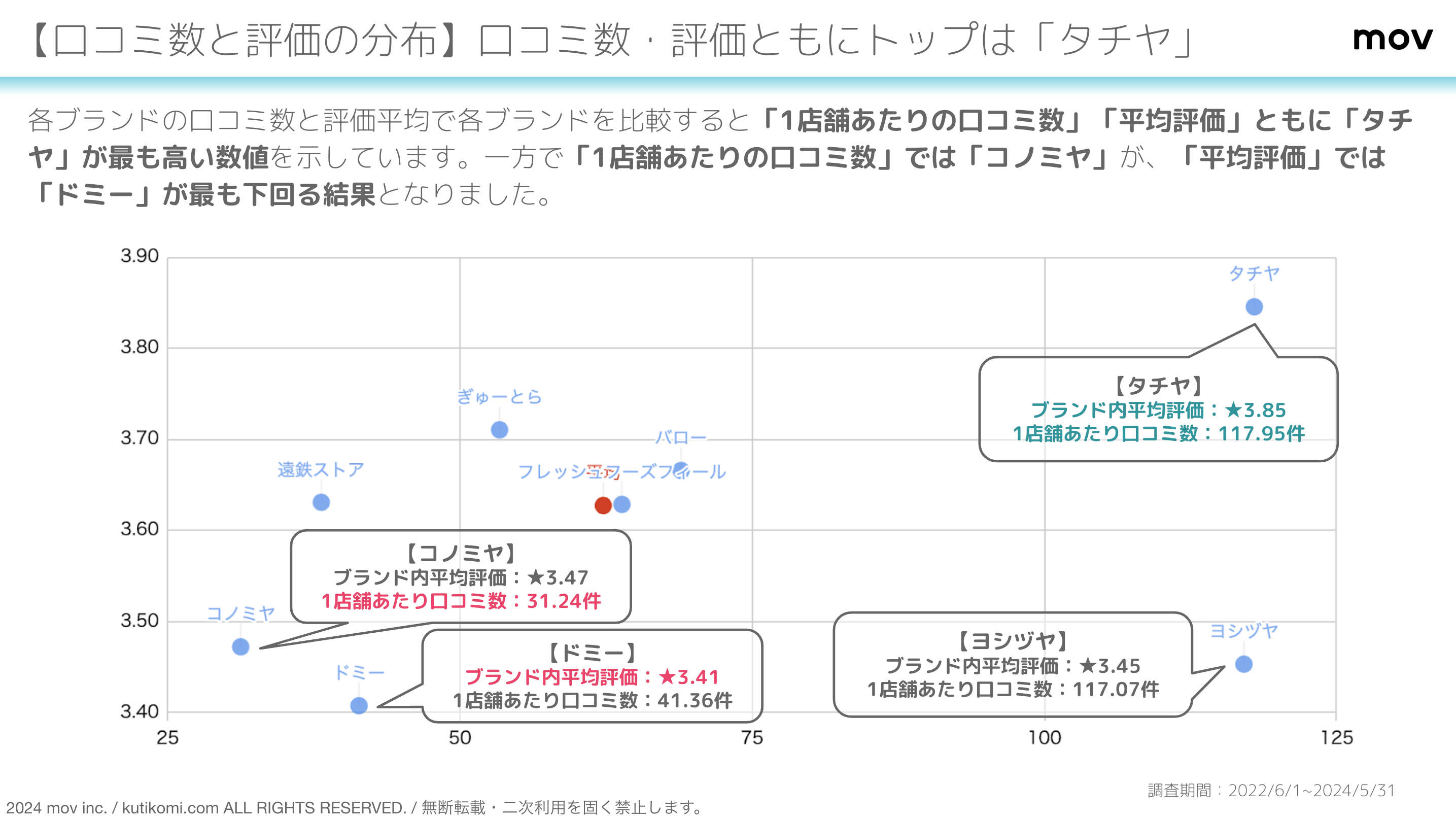 一方で「1店舗あたりの口コミ数」では「コノミヤ」が、「平均評価」では「ドミー」が最も下回る結果となりました。