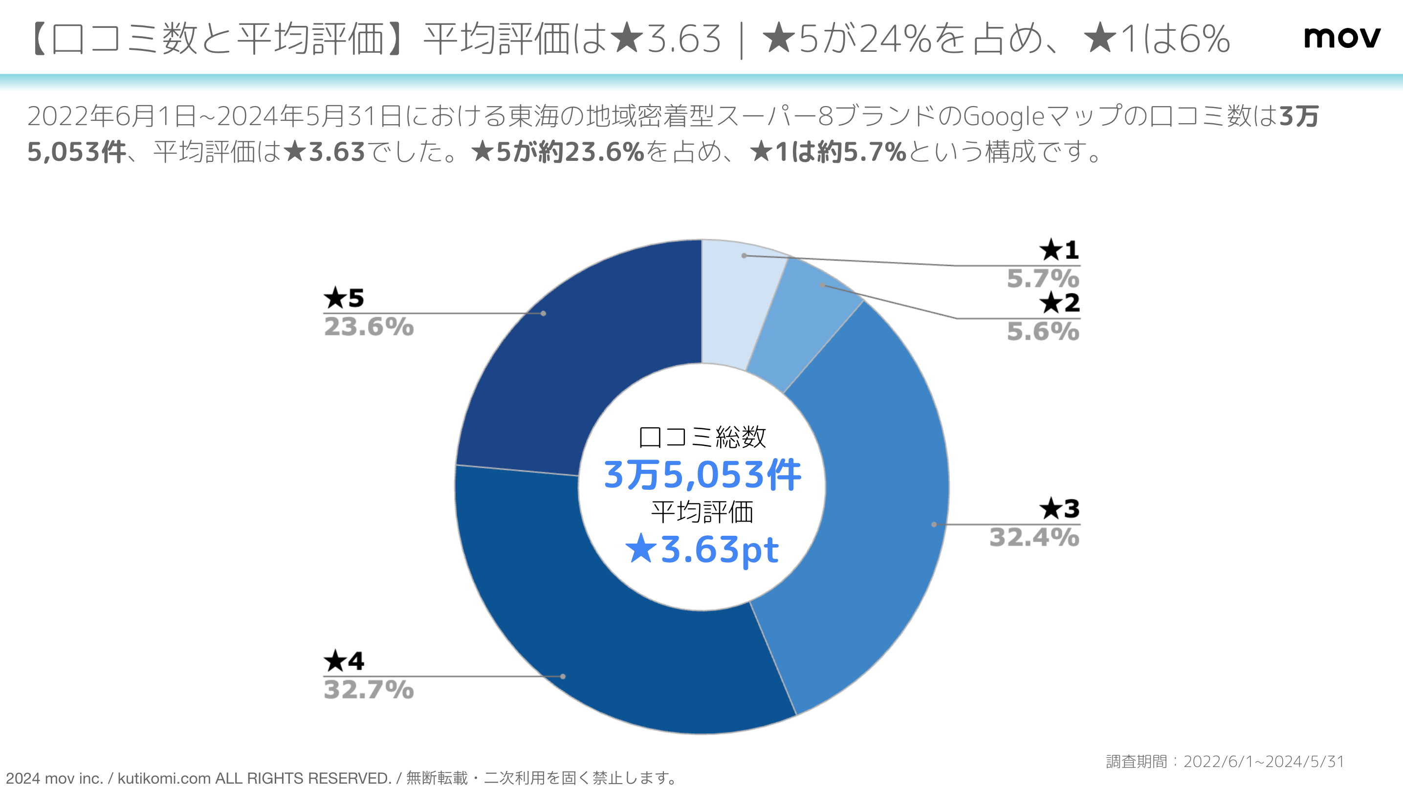 2022年6月1日~2024年5月31日における東海の地域密着型スーパー8ブランドのGoogleマップの口コミ数は3万5,053件、平均評価は★3.63でした。