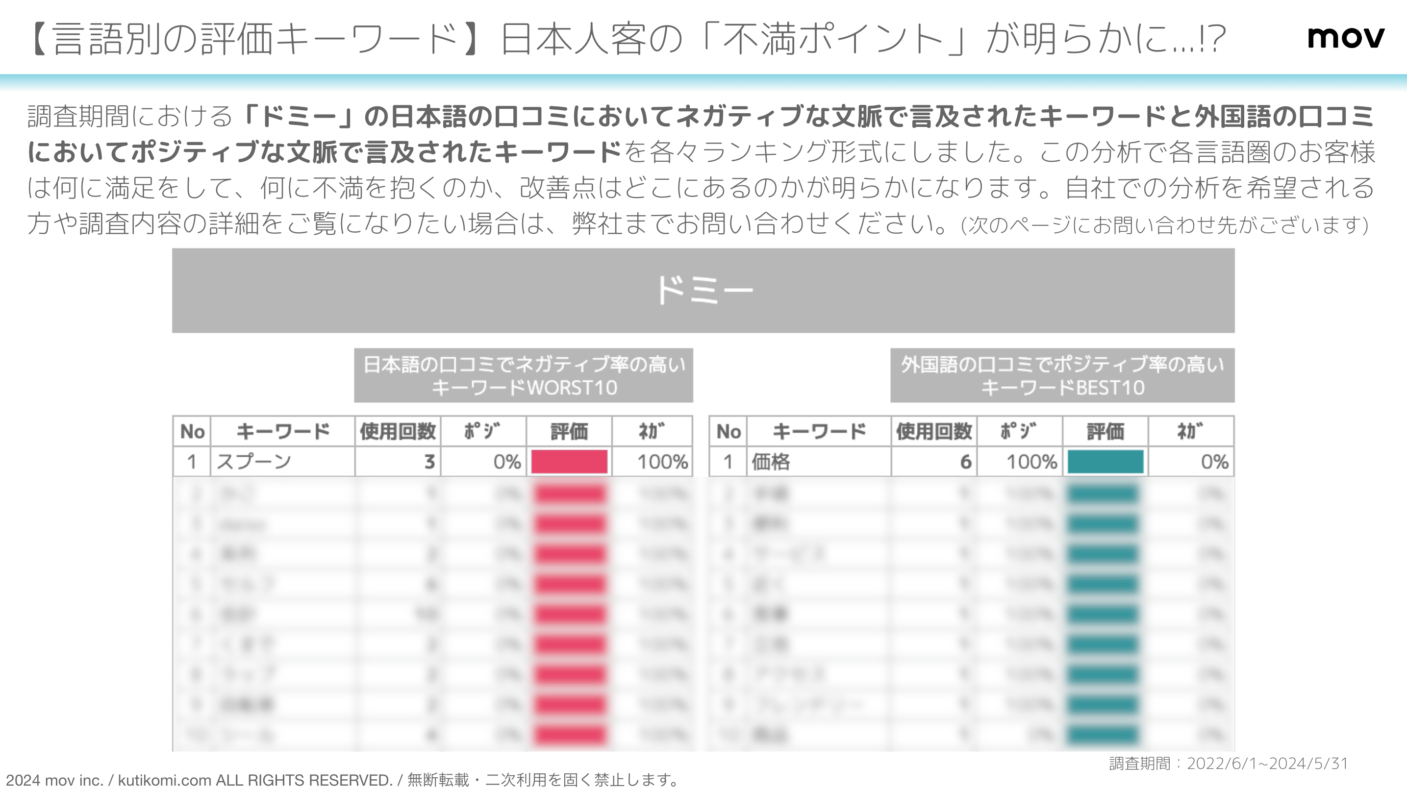 調査期間における「ドミー」の日本語の口コミにおいてネガティブな文脈で言及されたキーワードと外国語の口コミにおいてポジティブな文脈で言及されたキーワードを各々ランキング形式にしました。