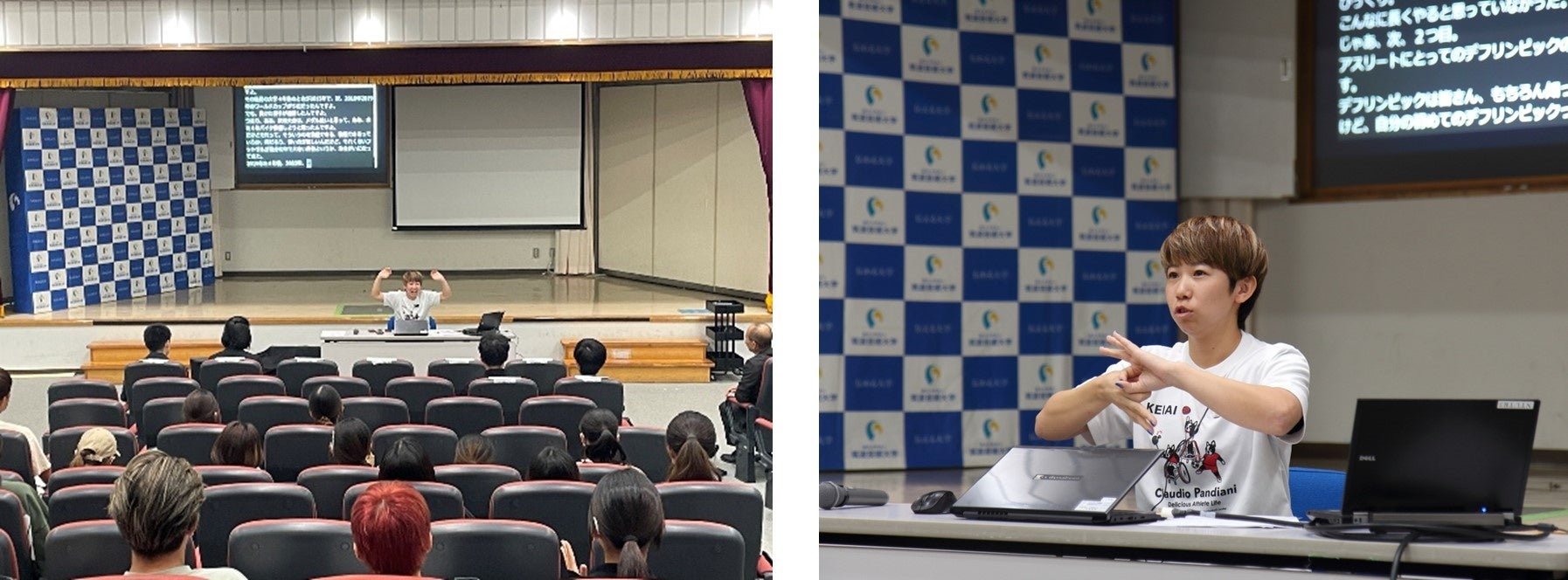 自身の母校で講演をさせていただくのは不思議な感じでしたが、学生のみなさんに少しでも興味を持ってもらえたら嬉しいです。学生たちがデフリンピックのサポートスタッフに応募するかどうかに関わらず、みんなで東京2025デフリンピックを盛り上げたいです。どの立場にいても応援することはできます。そして、その応援がアスリートの力になります。特に若い方たちのエネルギーは素晴らしいので、ぜひ発揮してもらえたら嬉しいです。貴重な機会をいただき、ありがとうございました。