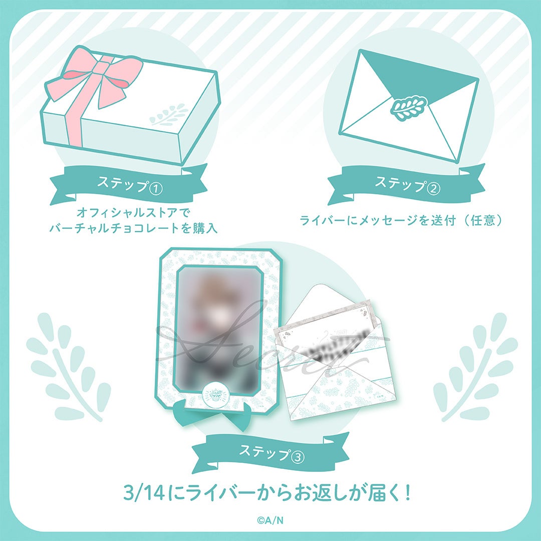 にじさんじオフィシャルストアから、バーチャルチョコレートをライバーにプレゼントすると、撮りおろしビジュアルを使用したフォトスタンド付きフォトカードと、複製手書きメッセージ入りのメッセージカードが特製プレゼントBOX入りでお返しとしてホワイトデー当日に届きます!