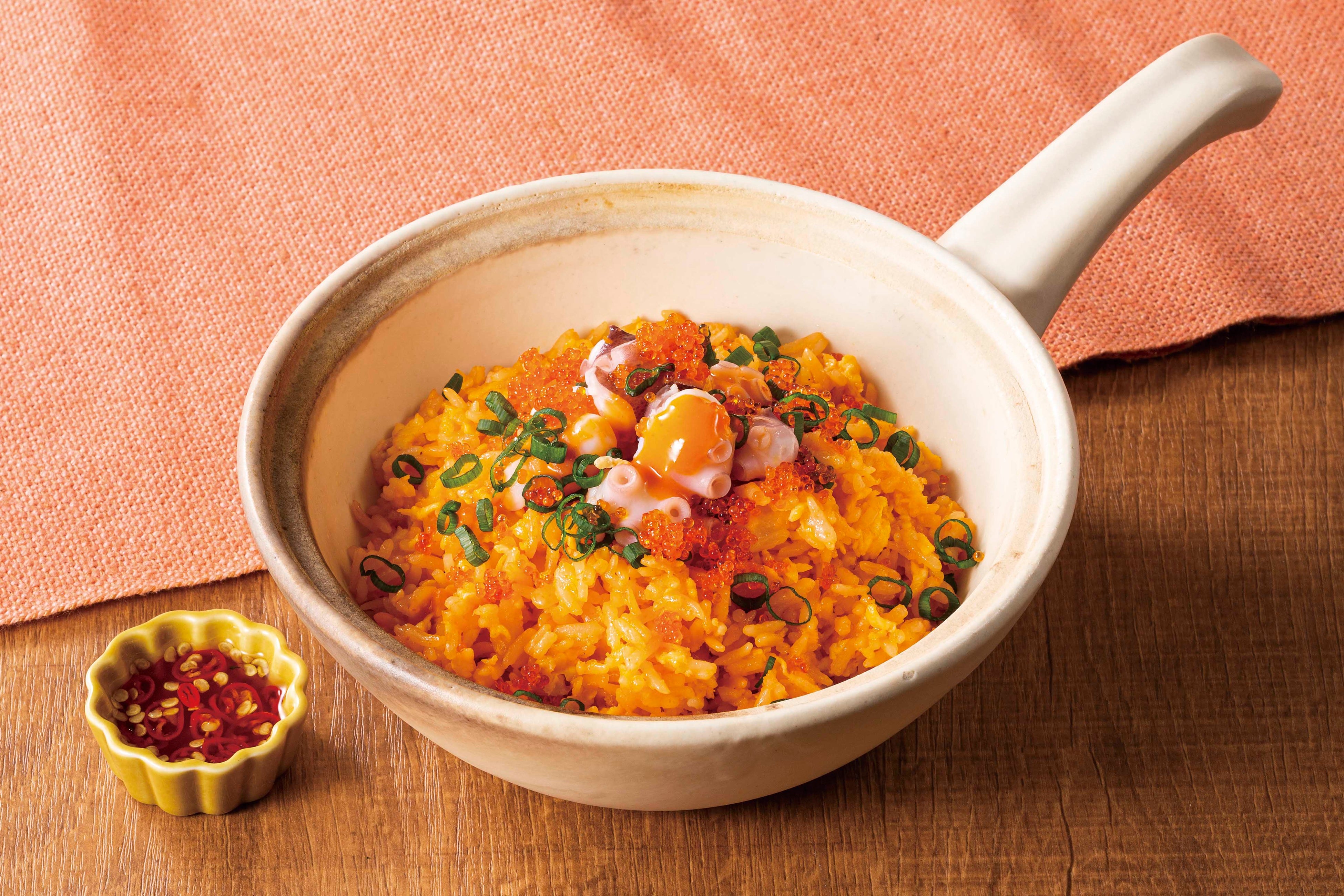 タイ産ジャスミンライスと玉子を、練りウニのソース、タイの醤油“シーユーカオ”や“シーズニングソース”、ナンプラーを使って香ばしく炒めたチャーハン。仕上げにタコとウニソースをかけ、食感のアクセントにとびっこを加えた、海の香り漂う一皿です。パラっとした仕上がりでしっかりとした味付けなので、お酒ともお召し上がりいただけ、唐辛子入りナンプラーでスパイシーに味変するのもおすすめです。