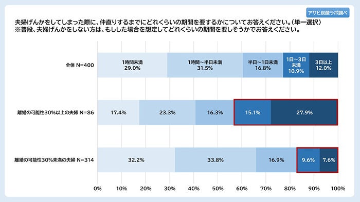 夫婦げんかの中身を調査してみました。夫婦げんかからの仲直りの期間を調査したところ、仲直りまでの期間が「1日以上かかる」と答えた割合が新米夫婦に比べ、熟年夫婦の方が高いことがわかりました。新米夫婦の8割以上(87.0%)が「1日未満」で仲直りすると答えたのに対し、熟年夫婦は3割以上(32.5%)が「1日以上」と回答しています。