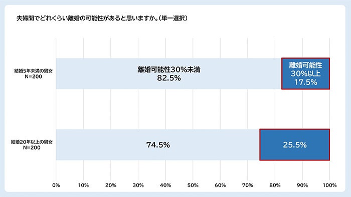 離婚の可能性について聞いてみると、結婚5年未満の新米夫婦は17.5%が「離婚の可能性30%以上」と答えたのに対し、結婚20年以上の熟年夫婦は25.5%と熟年夫婦の方が高いスコアとなりました。厚生労働省の人口動態統計特殊報告 2022年度「離婚に関する統計」でも熟年離婚の割合が上昇傾向になっているという結果がでましたが、本調査もその結果を裏付けるものとなりました。