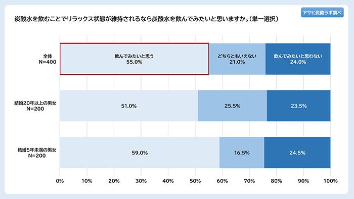 最後に、リラックス状態が維持されるなら炭酸水を飲んでみたいか聞いてみたところ、半数以上(55.0%)の夫婦が「飲んでみたい」と回答しました。