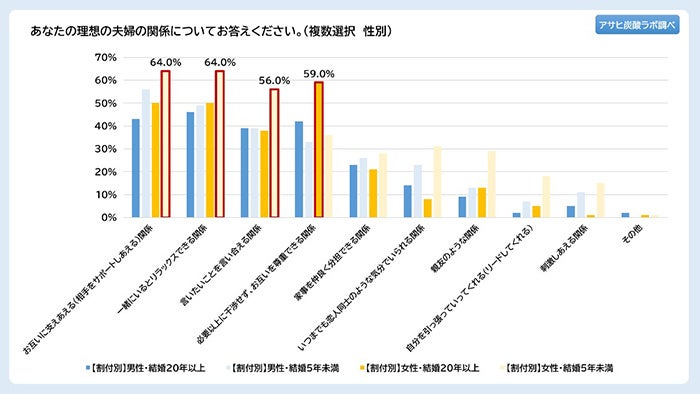 まず理想の夫婦関係について聞いてみると、熟年夫婦は「必要以上に干渉せず、お互いを尊重できる関係(50.5%)が新米夫婦より高い傾向にあることがわかりました。一方、新米夫婦は「お互いに支え合える関係」(60.0%)が最も高く、熟年夫婦は互いの尊重、新米夫婦は互いに支え合うことを理想と考えていることがわかりました。