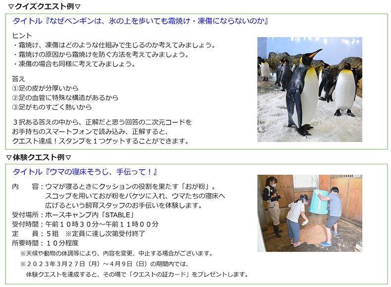 開催期間中、株式会社Terravie(本社 大阪府大阪市、代表取締役 田中 尚樹 様)とコラボした、お手持ちのスマートフォンでご参加いただけるデジタルスタンプラリーイベント「どうぶつクエストアドベンチャー」を実施いたします。本イベントは、パーク内各所のクエスト(動物三択クイズや飼育スタッフのお手伝いなどの特別体験)に参加しクリアポイントを集めることで”クエスト達成の証”(オリジナルグッズ)と引き換えることができる体験型イベントです。
